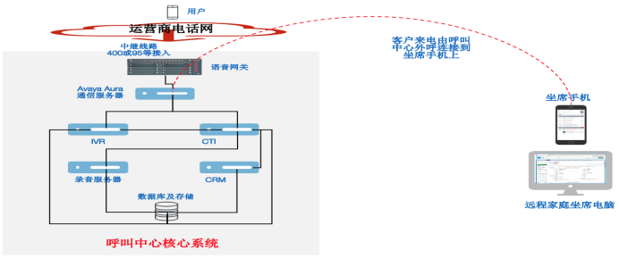 此方式下,可以在呼叫中心通信系统内,通过数据配置将座席的呼叫中心内网分机与其手机(也可以是座席家庭座机)实现联动。联动后,座席可以通过运营商电话网远程拨入呼叫中心系统实现座席的签入、示闲、置忙、签退等多种操作。当客户来电时,客户的呼叫可以被呼叫中心通信系统自动外呼接续至联动的座席手机上实现通话,正常完成与客户的交互。