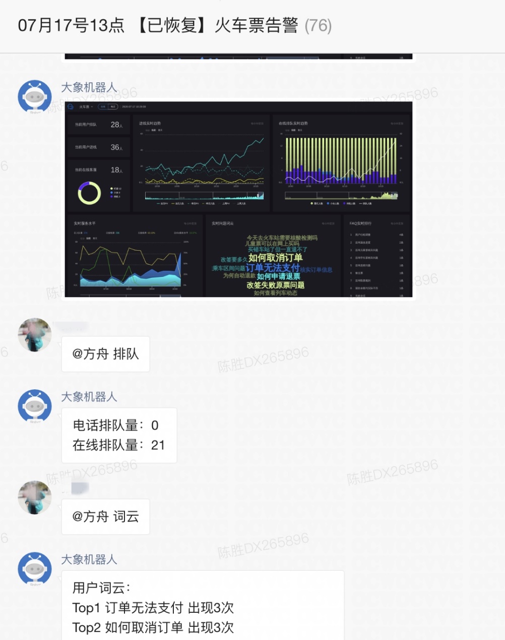 在这个过程中,我们需要根据峰值级别的提升,再自动拉取其他需要同步的管理者或者PR相关的同事进行信息同步,方便后续辅助方案决策。为了方便群内人员及时了解到更快信息,系统除了定期同步最新的数据之外,群里也提供了一个群智能助手,通过主动向群智能助手进行询问,可以得到最新的排队数据、天气情况以及用户和客服侧最新进展(该点在解决阶段也会提到),通过群智能助手还可以把一些方案快速地在客服侧和用户侧进行执行,在执行的同时,也把执行时间和方案本身同步给群内成员。
