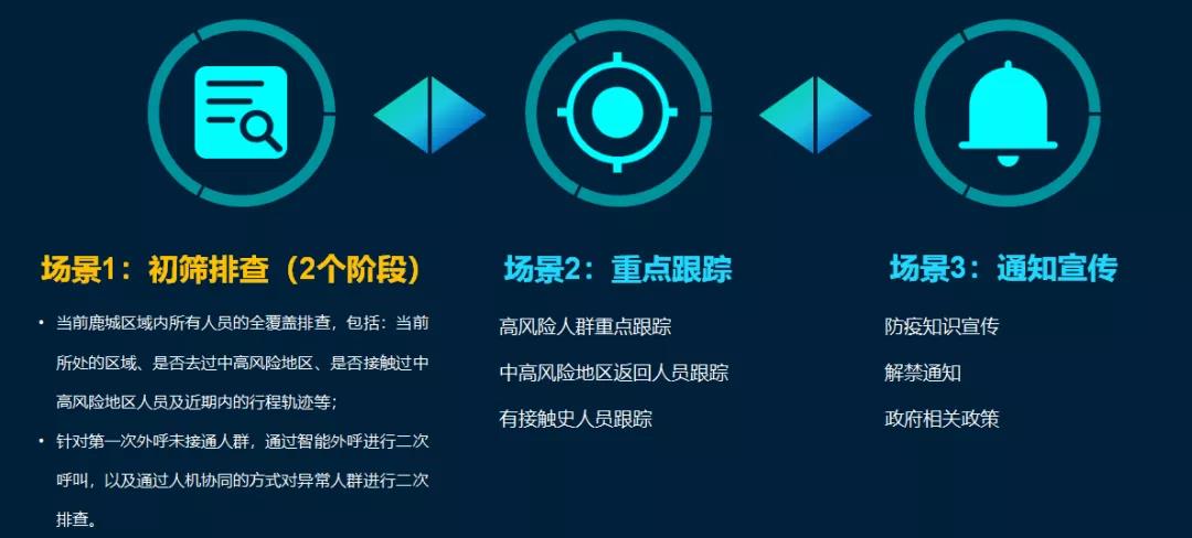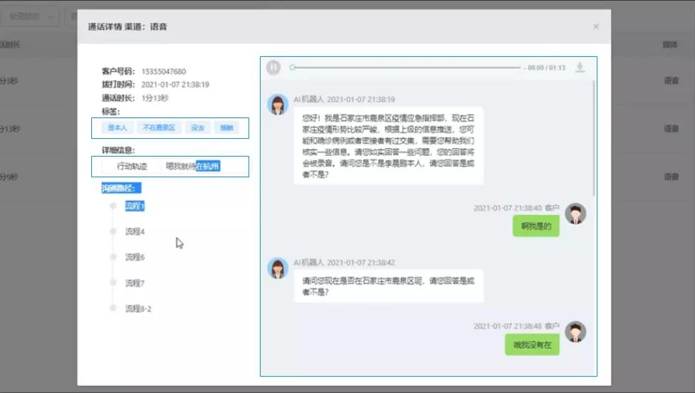 1月8日,正式接入当地区域大数据,“防疫防控机器人”开始对石家庄鹿城泉区人员进行呼叫核实。先通过智能语音呼叫方式初筛排查后,再辅助人工客服重点跟踪核实,高效快捷地筛选排查出区域内接触过中高风险地区人员。
