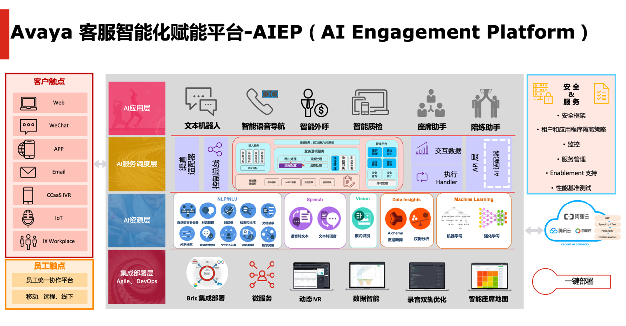 过去一年,我走访了很多Avaya的客户,有一点大家都认同,未来所有的客服都会实现智能化改造。在改造过程中,原有客户服务中心的提供者应该提供什么样的便利,让我们的客户更顺利地拥抱智能客服的新世界,解决他们在客服智能化改造过程中的痛点,这对我们每一位行业从业者,都是新的课题。为此,从去年12月开始,Avaya作为拥有众多优质客户的客户服务中心平台厂商,开始为Avaya的客户提供AIEP(AI Engagement Platform)客服智能化升级赋能平台。