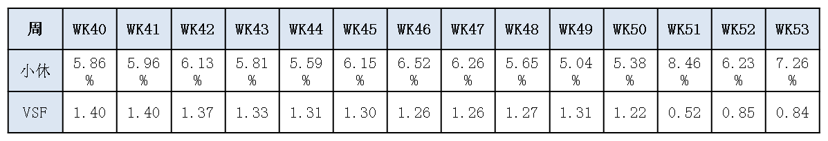 小休率是反映员工是否合理安排自己的休息时间,管控小休率可以减少现场波动,提高客服代表利用率,确保现场的承接。小休率的预测可以采取和缺勤一样的预测方式,通过历史数据中VSF比较稳定的一段周期取值,如下表所展示,可以看到WK40到WJ53这一段周期的小休率,其中WK40-50这一段周期的VSF是0.52,那就说明这段周期的小休率比较稳定,再无特殊情况下可以直接采用这段周期的均值当做未来周期的小休耗损预测;