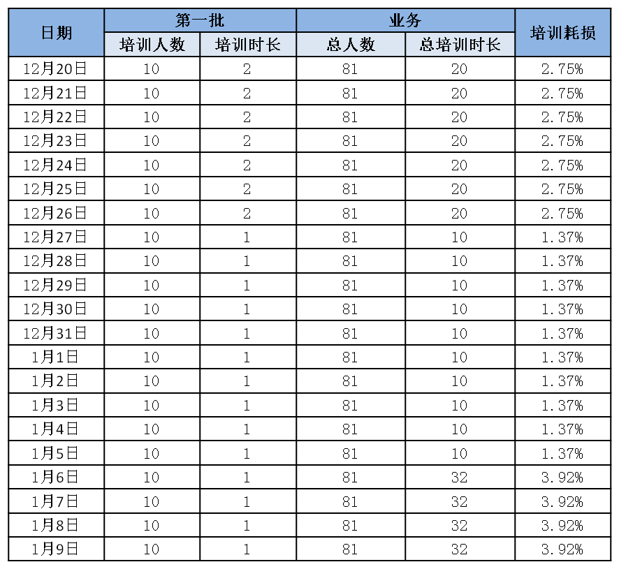 新员工培训耗损的计算方式可通过(培训人数*培训时长)/(业务总人数*8小时)测算未来每天的培训耗损,某业务12月20日开始新员工跟岗,那么业务所产生的培训耗损就如下表中所示;