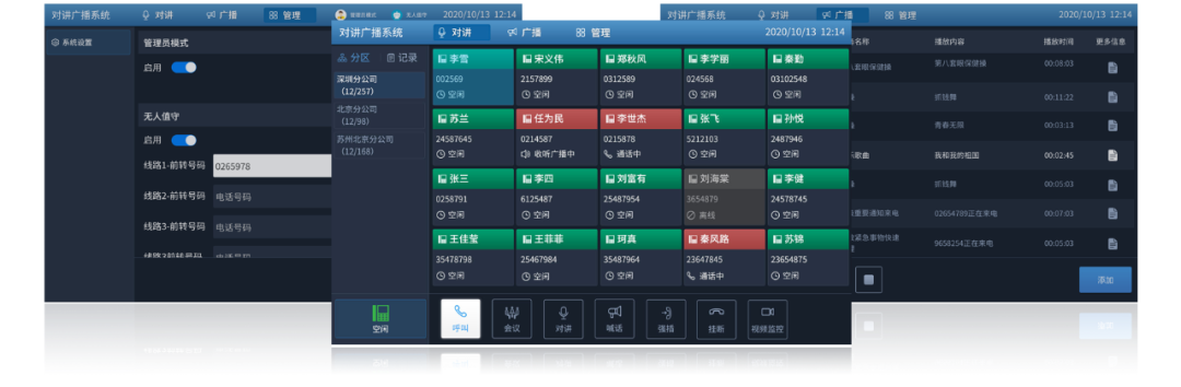 A32i内置广播对讲系统,在内网可实现与方位终端自组网,实现教育机构、购物中心、楼宇园区、公共场所等应用场景的分区或全区(定时、文字、喊话)广播、对讲、会议、无人值守、报警联动、IP摄像头视频联动等多功能融合,既节省投资又能提高沟通效率。