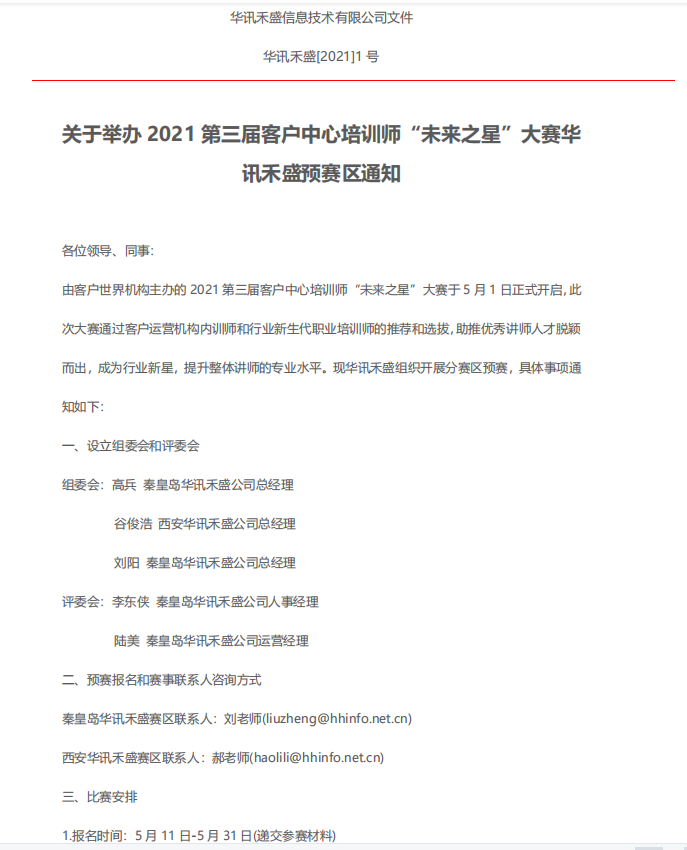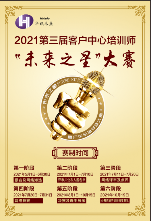 由客户世界机构主办的2021第三届客户中心培训师“未来之星”大赛于5月1正式开启,此次大赛通过对客户中心运营机构内训师和行业新生代职业培训师的推荐和选拔,助推优秀讲师人才脱颖而出,成为行业新星,提升整体讲师的专业水平。现组织开展华讯禾盛赛区预赛,事项通知如下: