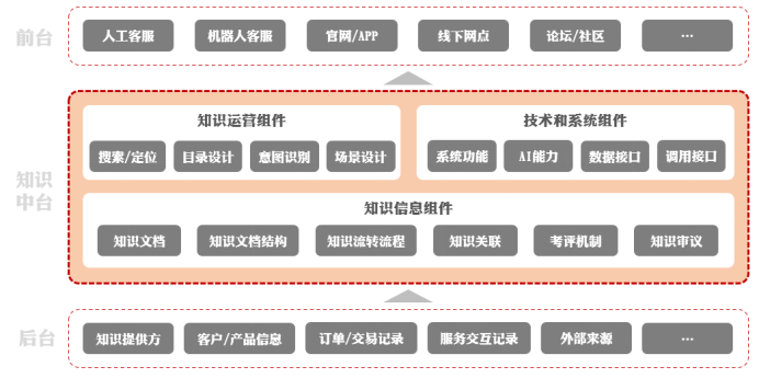 知识后台:知识信息作为服务解决方案所需的底层资源,包括分散在组织内部各职能部门,如来源于市场、采销、售后、财务、合作方等知识提供方的文档或流程;积累在各类IT系统中的信息,如客户管理系统、财务系统,产品系统,仓库物流管理系统等所产生的数据信息;沉淀在员工脑海中的知识和经验,外部网络平台上的用户经验分享等等,这些信息源构成了知识后台。