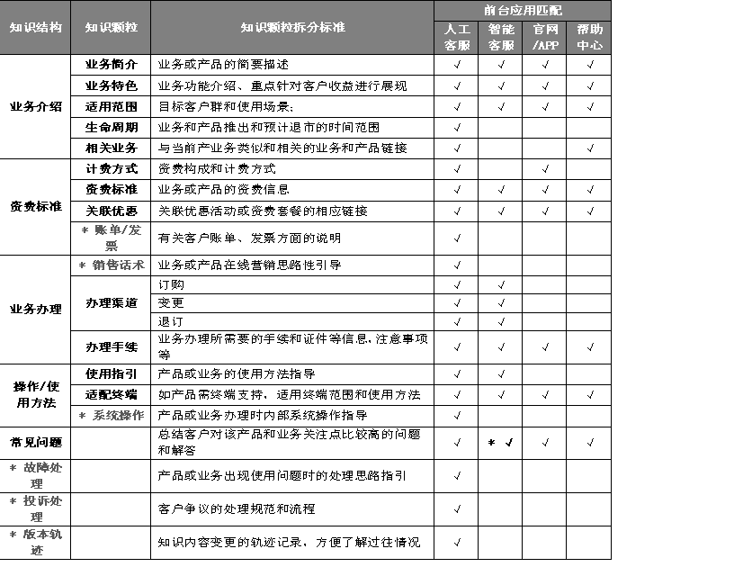 2、在这个知识管理体系下连人工客服的调用都不能很好的支撑,就更跟不上智能、自助等前台知识信息调用和创新的节奏了,这些前台服务场景对知识信息的颗粒度、场景标签、客户关联、调用意图识别等能力的实现,强依赖于在知识底层根据信息属性和分类做结构化设计,实现颗粒维度知识采集,满足前台服务场景对信息调用精度的要求,背后需要基于整体服务策略和信息体量,结合服务渠道和务场景,对知识采集流程和加工方法进行重构(表1)。