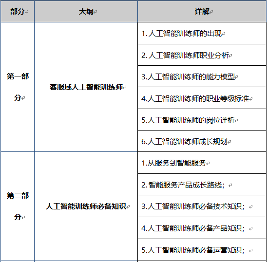 综上所述,无论是从企业的业务、客服的诉求,还是产品的进步、从业者的迷茫来说,客服部门都需要回归本职轨道,重点关注智能时代客服人员(即人工智能训练师)的成长及能力发展,才能让人工智能技术发挥出应有的价值。2020年2月21日,国家职业资格培训鉴定实验基地人工智能高新技术能力评价考试项目已实施,旨在培养人工智能技术服务和开发应用型人才。 2020年2月25日,人力资源社会保障部与市场监管总局、国家统计局联合向社会发布了人工智能训练师新职业,这是自2015年版《中华人民共和国职业分类大典》颁布以来发布的第二批新职业,2020年3月26号,中国国际贸易促进委员会发布人工智能训练师职业能力要求。2020年新春来临之际,一场突如其来的疫情给我们的生活及工作带来了很大的影响。这场没有硝烟的战争, 同时也加速了客服中心往智能化服务的转型。但是基于智能化客服客服中心转型的时代背景下,智能服务产品本身训练的高门槛,新的技术下面的运营方法,导致企业无法明确训练师岗位的职级划分、能力模型界定,智能服务产品能够发挥的能效大大被降低,那么人工智能训练师到底需要具备哪些技能和素质,到底如何培养?训练师又该如何快速掌握人工智能产品的核心?如何通过非技术干预下,快速从0到1建立具备完善知识体系以及问答体系的人工智能服务机器人?都是准备设立或已有人工智能训练师岗位的企业普遍关心的问题。包括: