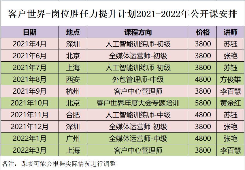 我们推出的这一套课程将仅仅面向“客服域”或“2B2C”的业务场景。专是为了深,去除浮躁,和行业有识之士共赴这一场凤凰涅槃之旅!我们将在全国各地、面向各主要细分市场、持续执行公开课程培训计划,在此基础之上配合相关企业的培训体系提升和内训计划执行。