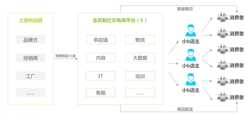 通过S2b2c模式,平台整合电商要素,负责从选品采购、仓储、物流、售后客服等全供应链流程,通过销售提成刺激用户成为分销商,利用其自有社交关系(构建社群)进行分享裂变,实现“自购省钱,分享赚钱”,平台则销售商品、会员服务、获取新客、广告变现等。