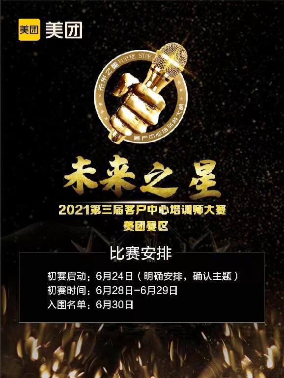 助推讲师脱颖而出,推动行业蓬勃发展。6月24日起,由客户世界机构主办,由美团承办的2021年第三届客户中心“未来之星”培训师大赛美团分赛区正式启动。本赛事面向美团所有职场的培训师及培训爱好者招募,旨在创新讲师培养模式,为培训师搭建提升专业、选拔展示的舞台,进一步打造学习型组织、提升我司核心竞争力。