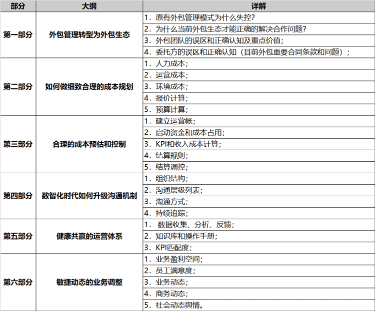 现场讲授: 外包业务的成本计算、评估和规划;外包业务的收入盈利计算、成本控制;如何建立全方位的沟通反馈渠道,保障运营一体化?如何保障运营健康度?如何保障业务健康度?包括:具体的实际落地案例的展示,小组讨论,模拟,告别理论,内容实战。