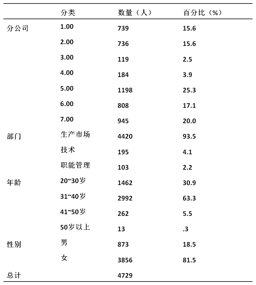 采用整群抽样方法,以某国有企业大型客户中心7省分公司的员工为调查对象。共发放标准化心检问卷5370份,回收有效问卷4729份,回收有效率88.06%。