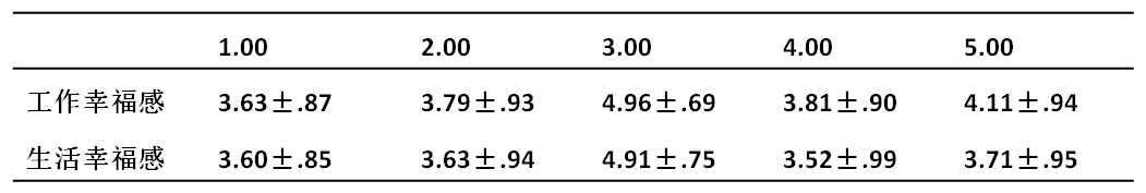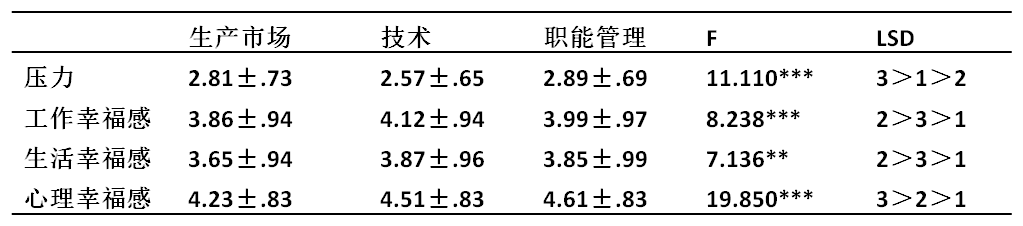 表5 压力、工作幸福感、生活幸福感、心理幸福感在不同岗位之间员工的差异检验