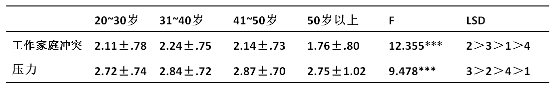 表4工作-家庭冲突、压力在不用年龄之间员工的差异检验