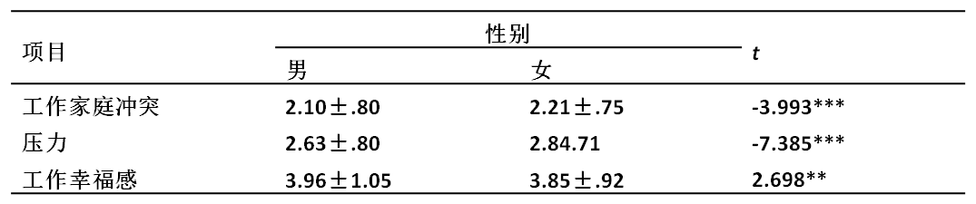 表6 工作家庭冲突、压力、工作幸福感在不同性别上的差异检验