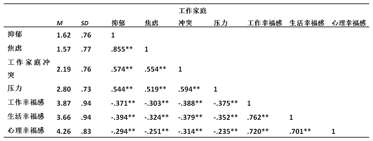 从数据分析结果来看,各指标间相关关系均十分显著,将抑郁、焦虑、工作家庭冲突、压力作为负向观测标准,将工作、生活、心理幸福感作为正向观测标准,可以看出不同标准内均呈显著正相关,不同标准间均呈显著负相关(见表7)。
