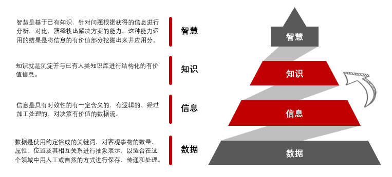 做这些调研和分析的目的,在于改变传统单纯以公司产品/业务上新或变更触发采集、发布、培训应用的知识管理方式。而是把策略调整为根据客户和员工的需求触发信息采集动作,所以在设计知识管理流程时,最优先考虑的是前台服务场景的需求,即客户、员工、智能机器人需要什么样知识,这些知识包含哪些信息,如何处理才能成为可用的知识?这里涉及到两个概念,即信息和知识,它们所处的层级是不一样的,这里借用一下知识阶层图(图2)来加深大家对数据、信息、知识和智慧之间关系的理解。