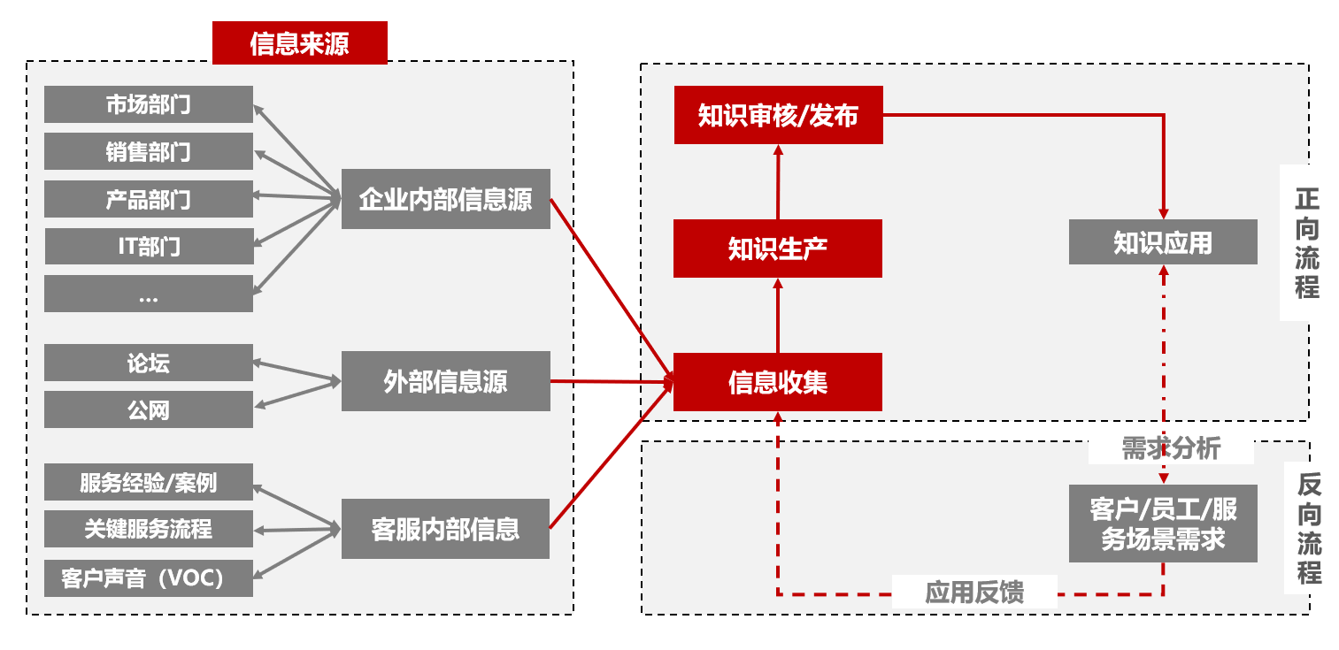 信息来源作为知识后台,基于客户服务体验和业务拓展诉求,根据各自职能和业务与知识中台对接,设置内部信息对接责任人,当所涉及的产品资料、业务规则、营销活动、系统功能、操作手册、通知公告等发生新增、变更、废止时,按照知识采集组件传递至至知识保障团队触发信息收集,生产、发布至各前台服务渠道供客户、员工调用,同时也许提供知识保障团队反向的信息核实、知识审核支持需求。