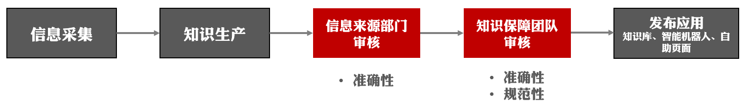 完成编辑的知识需反馈至信息源进行准确性审核,校验知识编辑过程中对对信息做删减、颗粒拆分、知识关联、客户化转化等加工是否存在因知识生产岗位理解造成的偏差。知识保障团队内部也需设置审核岗位,对知识内容进行准确性、规范性审核,以审议生产的知识是否满足各前台服务场景对于知识内容颗粒、表达方式、知识格式、客户化描述等方面的要求,通过两级审核后的知识一般发布在知识库人工座席、智能机器人、自助服务页面等渠道或场景调用;知识审核、发布环节需管控时效和准确性,可以通过审核及时性、准确性、知识满意度等指标观测和评价知识保障团队、信息来源部门在对接交互中的表现(图4)。