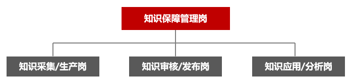 知识保障团队作为企业知识管理的收口职责,主要负责知识保障体系的规划建设、日常运营。具体工作包括根据各前台服务渠道需求对接各信息来源进行信息收集、知识生产发布、知识应用的数据监控、知识支撑能力审议优化等。根据工作职责在岗位设置上需包括知识采集/生产岗、知识审核/发布岗、知识应用/分析岗,各岗位选拔人员可以侧重在人员业务理解掌握能力、沟通推进能力、语言问题表达能力等,筛选具备各岗位能力要求的人员搭建知识保障团队。