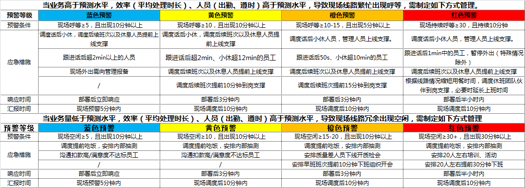 时段播报表分为三大模块进行数据的收集分析:“需求、排班与实际出勤”、“线路交付”、“现场管理”;其中“现场管理”模块需结合“现场实时管理应急方案”来进行填写,现场实时管理应急方案是根据业务日常管理的方案总结出来的一套方案,根据不同的预警情况执行不同的方案来确保现场无异常问题发生,具体如图1所示。