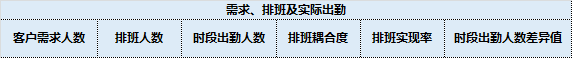 图2为时段播报表中“需求、排班与实际出勤”模块,此模块主要是进行现场人员的管理,各条目定义如下: