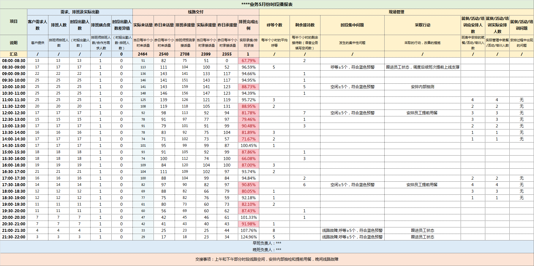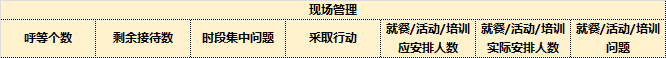 “现场管理”模块可以了解到每个时段的话量呼等/空闲情况,现场会根据实际各时段的话量情况结合“现场实时管理应急方案”进行现场管理,对于现场集中性问题记录清楚,现场的用餐及培训情况也需进行如实记录,此处需注意为现场实时问题记录清晰明了,便于后期回顾分析使用。