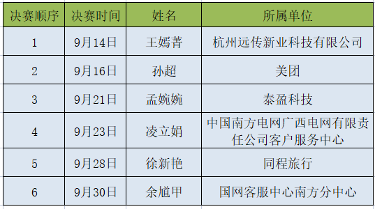9月5日下午,12强选手按照自选题目通过网络直播平台进行授课,12位评委全程观看比赛,并给予了选手专业的点评和指导。在3个多小时的直播比赛结束后,评委会召开了第三次评委会会议,经过激烈磋商,确认了6名选手进入“活力日照•新东港杯”2021第三届中国客户中心培训师“未来之星”大赛年度总决赛,并现场抽签确定了决赛的出场顺序: