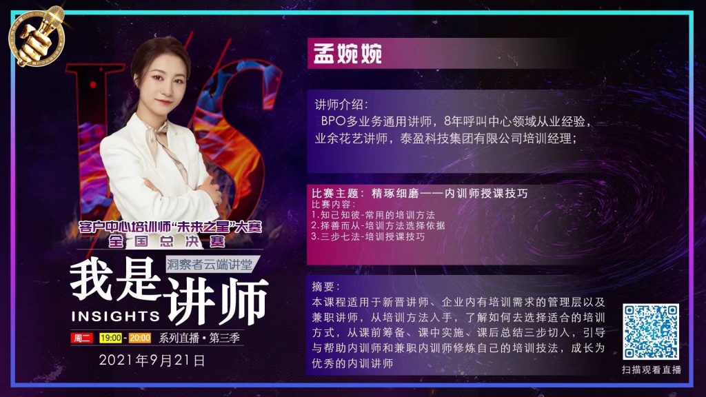 【我是讲师(第3季)】的主题是:未来已来;同时也是2021第三届中国客户中心培训师“未来之星”大赛-全国总决赛的比赛环节。选手通过自选主题/一小时直播和互动答疑的方式,展示培训师全面的能力和个人风采。9月21日19:00-20:00,总决赛第三位选手是:来自泰盈科技的孟婉婉。