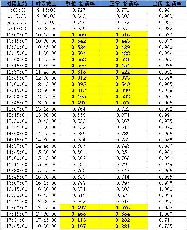 可以明显看出整体业务的高峰值出现在9:00-17:00(占比 80%) 而低接通率时间段11:30-13:00就占比25%,且在这一时间段排班之中有大量的座席在11:30-13:00进行午休,这就导致了在这样一段时间有大量的客户呼入,但是却没有足够的座席接通的情况(表3)。