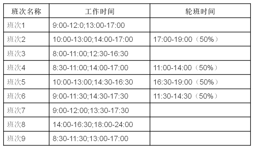进而产生一组排班计划,如表1(以某券商电话客户接待为例)。