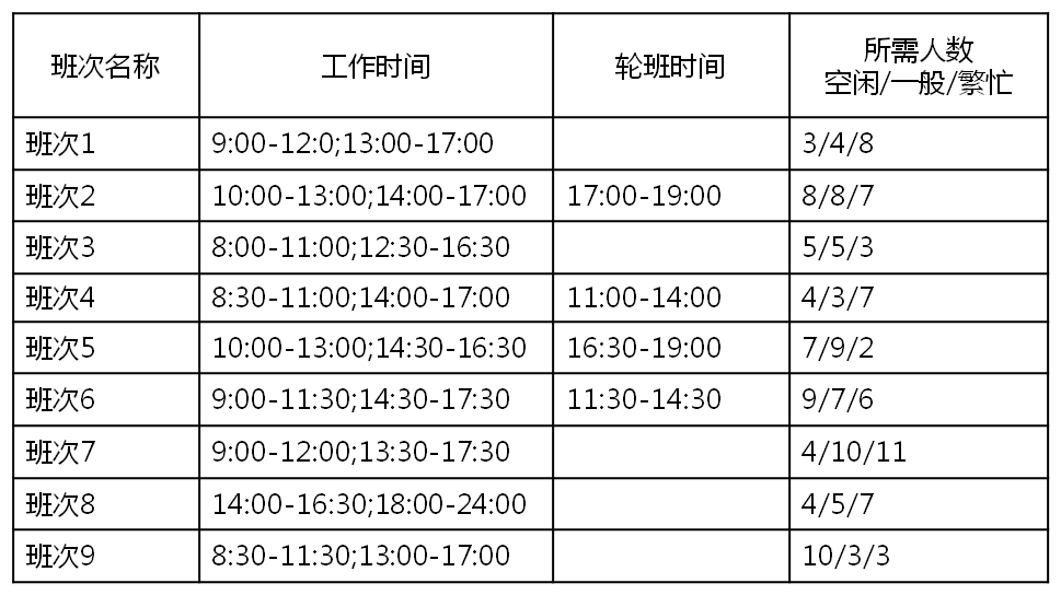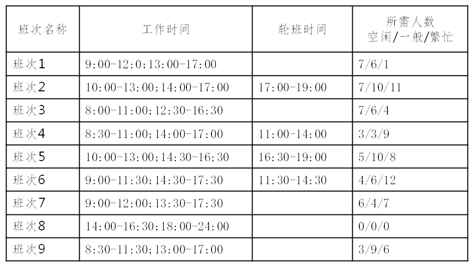 表8是在保持原有人数不变的前提下仅改变班次时间以及人数要求的情况,在这样的排班布局通过实验可以得到对应在不同业务繁忙度下的客户接通率,如表9。