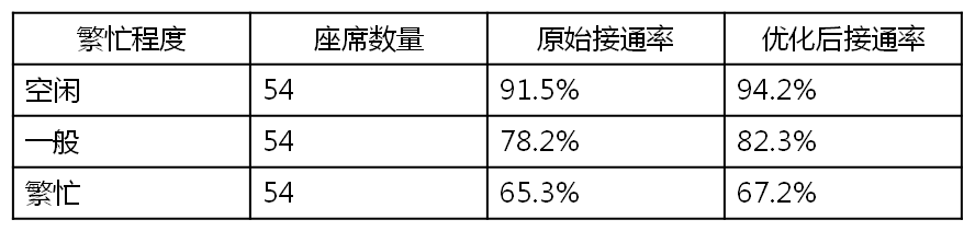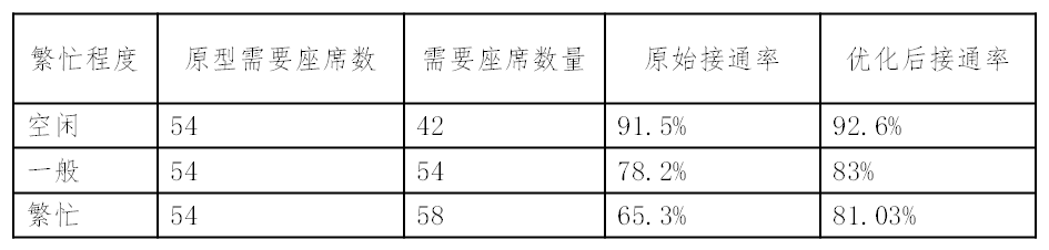 表6是在保持原有人数不变的前提下仅改变班次时间以及人数要求的情况,在这样的排班布局通过实验可以得到对应在不同业务繁忙度下的客户接通率,如表7。