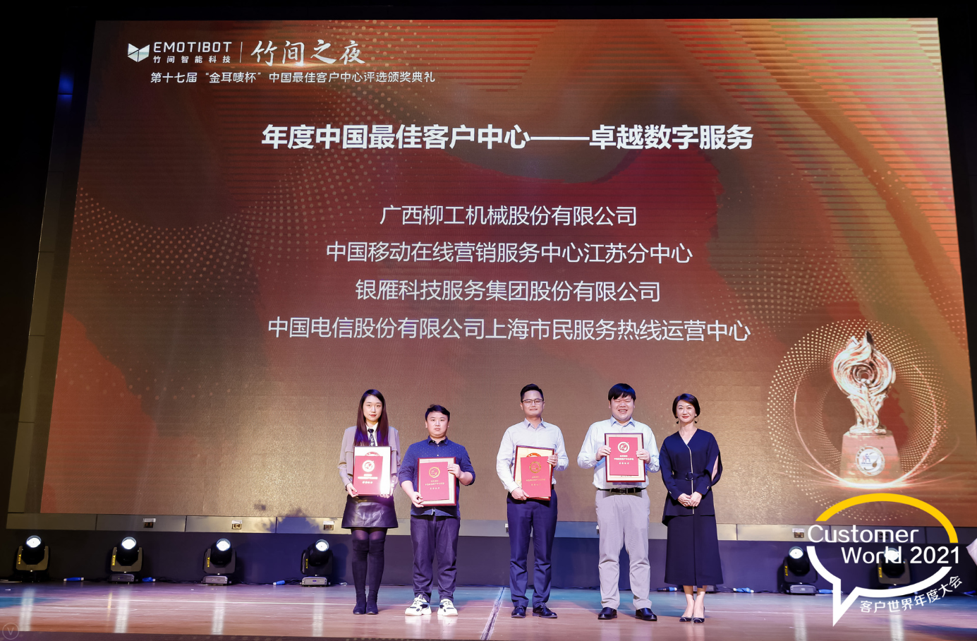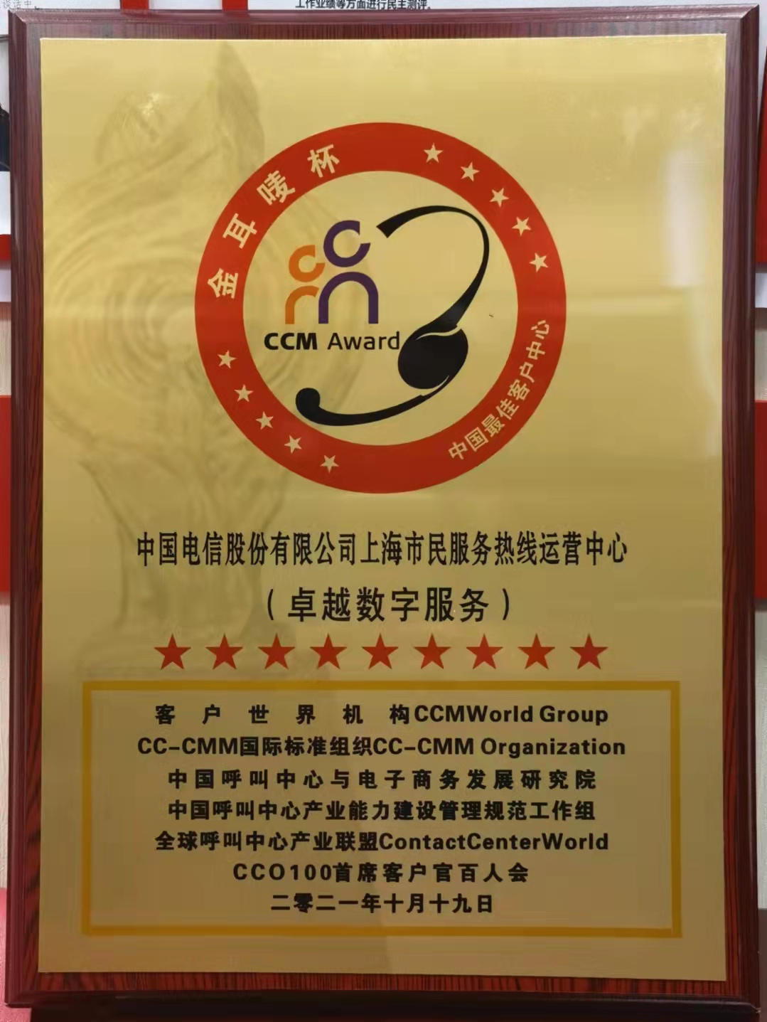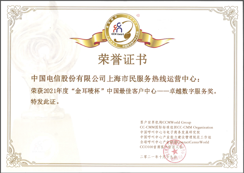 上海市民服务热线运营中心在本年度的“金耳唛杯”中国最佳客户中心评选中获得:卓越数字服务。客户世界机构向上海市民服务热线运营中心颁发2021年“金耳唛杯”中国最佳客户中心称号