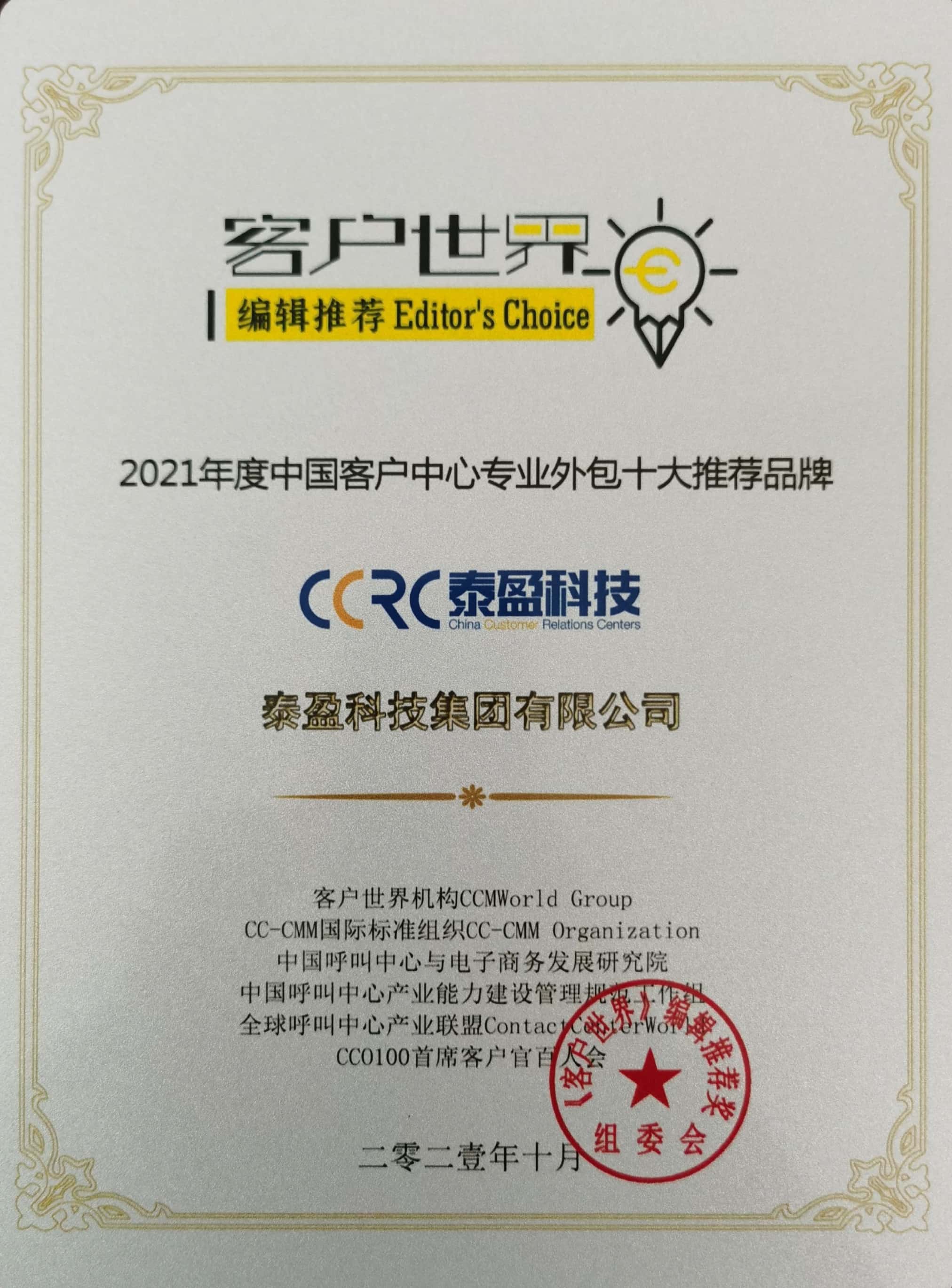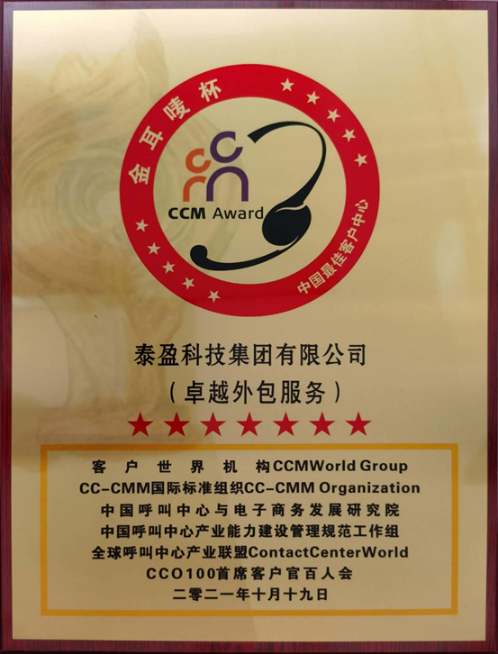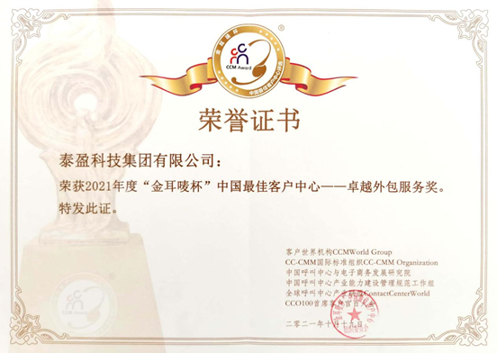 泰盈科技集团在本年度的“金耳唛杯”中国最佳客户中心评选中获得:卓越外包服务。客户世界机构向泰盈科技集团颁发2021年“金耳唛杯”中国最佳客户中心称号