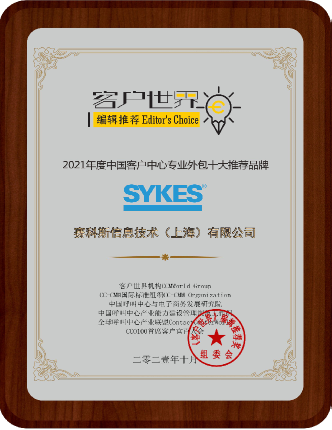 赛科斯中国(SYKES)荣膺《客户世界》编辑推荐 “2021年度中国客户中心专业外包十大推荐品牌”奖