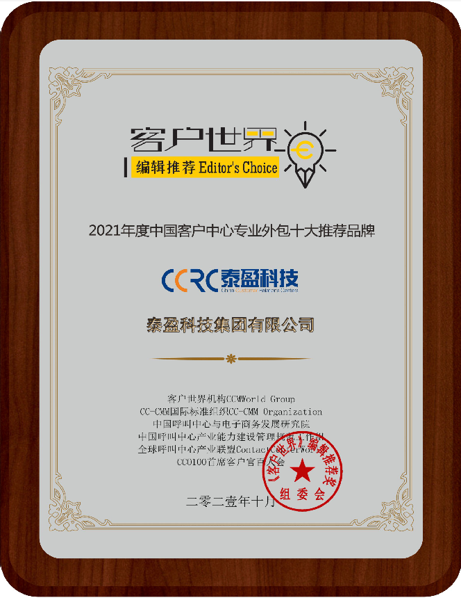 转载请注明来源:泰盈科技集团荣膺《客户世界》编辑推荐 “2021年度中国客户中心专业外包十大推荐品牌”奖