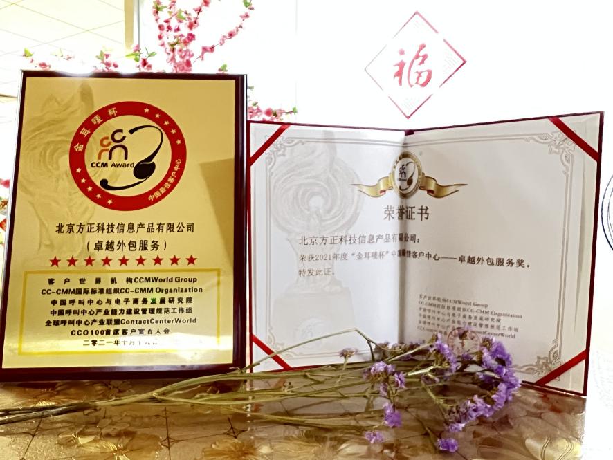 北京方正科技信息产品有限公司荣获2021“金耳唛杯”中国最佳客户中心卓越外包服务奖