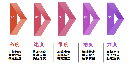 对于负面信息“解毒”,要坚持“五度”指导思想:态度、速度、维度、精度、力度,见图3。在“五度”基础上,行动力至关重要,体现为感召力(聚集资源协同应对能力)、调查力(查明事实与真相的能力)、定案力(制定合理解决方案能力)、兑现力(解决方案兑现能力)、传播力(信息沟通与传播能力)。具备上述“五力”,就具备了奉上信息大餐的能力——传播解决方案,取信社会。