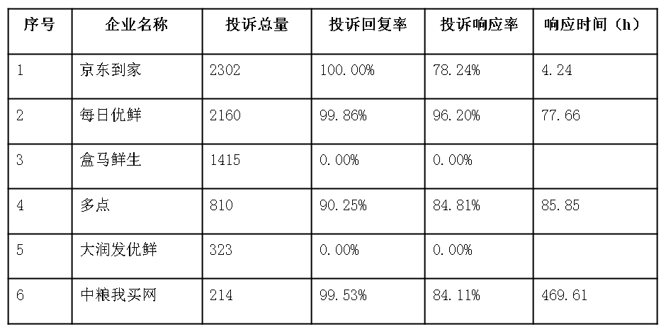 很多社区电商都被投诉甚至危机煎熬着,因为有些投诉与危机已经超越社区传播而蔓延至网络,网经社电诉宝、黑猫投诉等平台投诉案例屡见不鲜,处理不当直接危及品牌生存。2021年7月27日,黑猫投诉平台公布了一组顾客针对京东到家、每日优鲜、盒马生鲜、多点、大润发优鲜、中粮我买网等社区电商的投诉数据,数据对比通过喵达平台行业及竞品分析功能进行整理分析,对比了生鲜电商行业主流企业的投诉核心数据,包括企业有效投诉总量、投诉回复率、投诉完成率和响应时间,见表1。