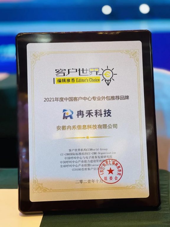 转载请注明来源:冉禾科技荣获2021年度中国客户中心专业外包推荐品牌