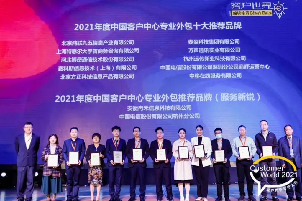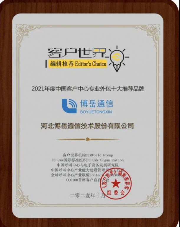 热烈祝贺:博岳通信荣获《客户世界》编辑推荐“2021年度中国客户中心专业外包十大推荐品牌”奖