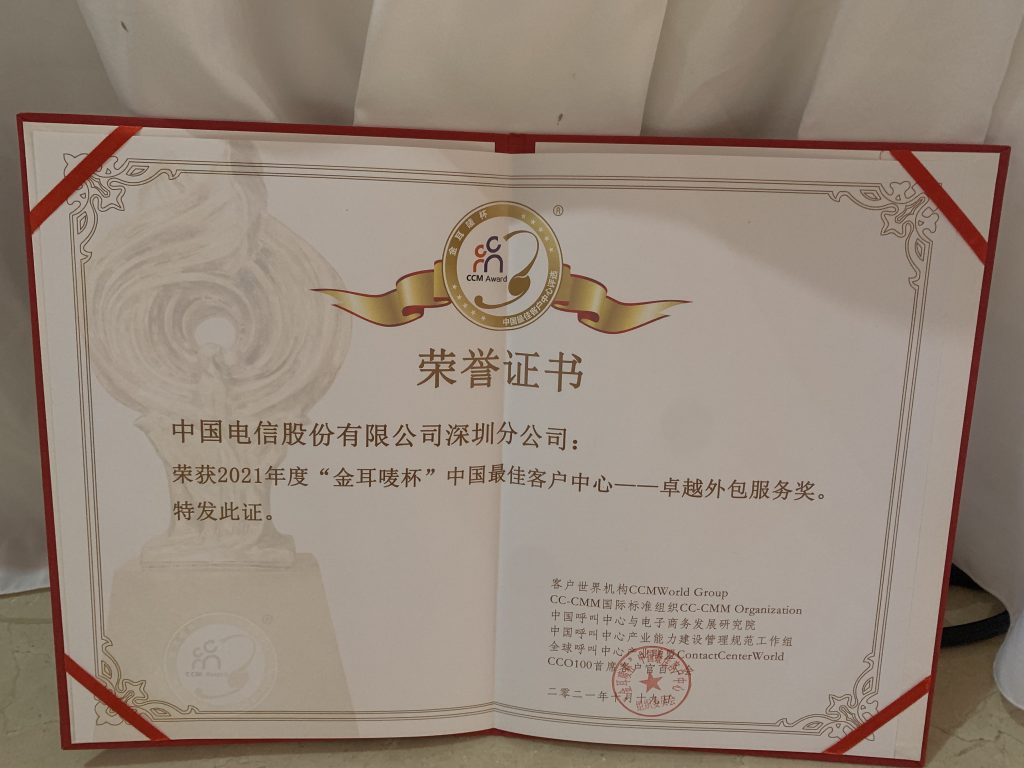 中国电信股份有限公司深圳分公司在本年度的“金耳唛杯”中国最佳客户中心评选中获得:卓越外包服务奖。