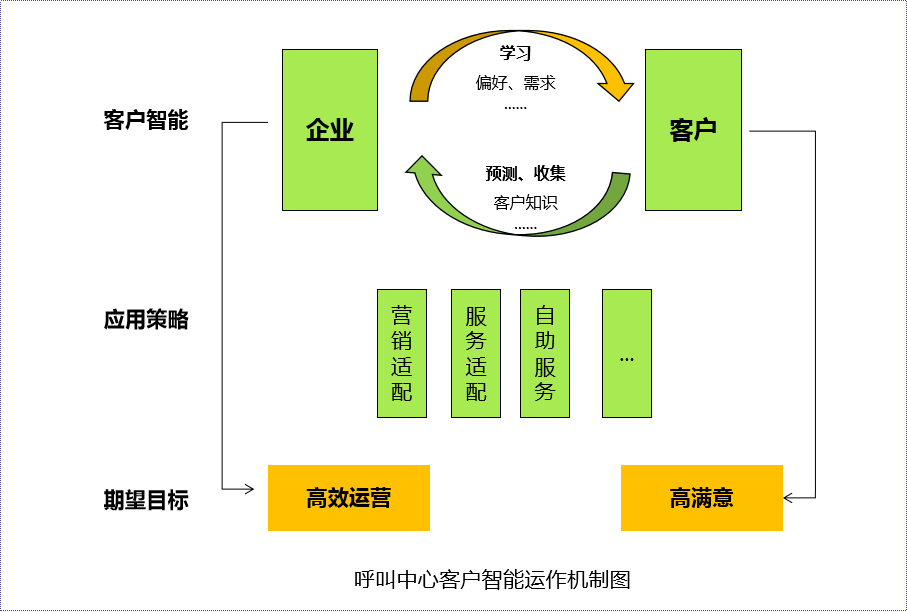 客户智能的概念有很多,放在呼叫中心行业,我们从具体的呼叫中心运作机制、运营价值。可以更具体的理解为,它是一种向客户学习的机制和关系。例如,在这个学习过程中,我们会获得各类客户群体更多的偏好(消费偏好、业务及服务订购偏好……)、需求(最新活动优惠、快速提供售后服务……),继而进一步预测“客户知识”,再通过有效地使用这些“客户知识”,使得企业获得更多竞争优势。此外,还可以结合“客户知识”,更多的教会“客户自学习、自助解决问题”,缓解人工服务压力(图1)。