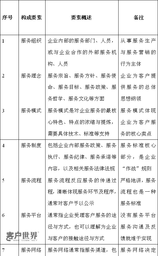 那么,企业的服务体系是由哪些要素构成呢?下面通过表格的形式对各要素加以概述:
