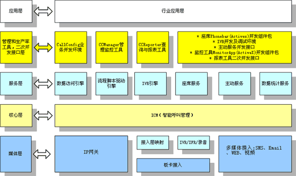 核心层是整个系统中最核心最复杂同时也最具智能化的一个部分,它完成呼叫控制、智能路由、座席管理、流程脚本解释以及系统互联等功能。媒体层和核心层之间采用统一消息接口(UMI)进行通讯。