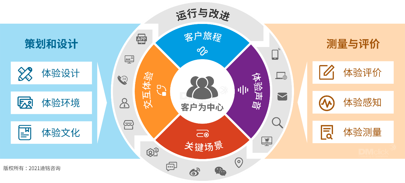 图1是迪铭咨询客户体验管理框架的一个简化示意,列出了客户体验的策划和设计、运营和改进、测量和评价的基本内容。