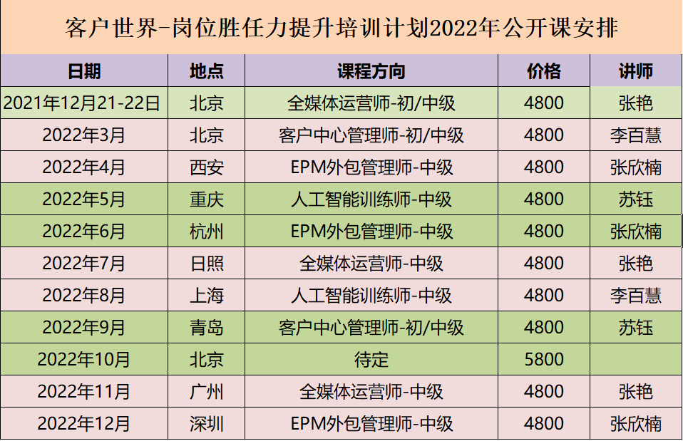 我们推出的这一套课程将仅仅面向“客服域”或“2B2C”的业务场景。专是为了深,去除浮躁,和行业有识之士共赴这一场凤凰涅槃之旅!我们将在全国各地、面向各主要细分市场、持续执行公开课程培训计划,在此基础之上配合相关企业的培训体系提升和内训计划执行。