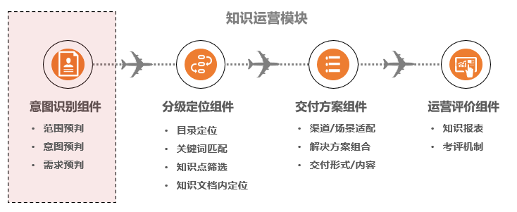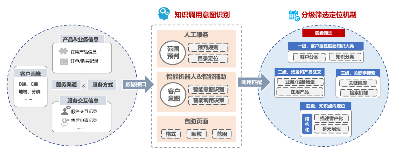 可以参考电商行业商品仓储和分拣的运转模式来类比理解知识的供、需关系,传统仓储管理方法是在仓库中划定区域,设置货架,货品来了分门别类上架,拣货时根据货品分类到相应区域和货架上找,一旦有货品规模放大和分拣提速的要求,这种运转模式就会成为整个货品交付效率的瓶颈。为了提高拣货速度和效率,就需要对传统的仓储管理模式做变革,提前预测客户购买行为,对商品销量做预判,动态调整商品存放位置、补货和调拨,让仓库智能起来,让商品动起来,以满足拣货“快”的需求。这个“快”同样适用于知识支持体系的建设,知识的存储和调用,原理上与实物货品的存放和分拣是共通的,传统基于业务和产品的知识库实际是一个按货架分类很粗犷的静态仓库,当人工坐席对知识调用有速度要求时,智能机器人对知识调用有精度要求时,这种方式显然是无法支持的。所以我们在推进知识体系建设时,以知识中台的知识调用预判组件,从客户服务需求出发,应用抓取到的客户数据、产品/业务信息、服务交互数据等,交给知识调用意图识别组件,根据人工服务、智能机器人、自助页面的解决方案和信息呈现需要,在知识库通过分级筛选定位机制,定位到组成解决方案所需知识颗粒或内容,建立动态的需、供关系,让知识库也能智能起来。