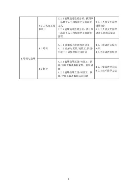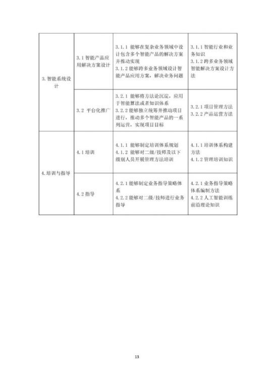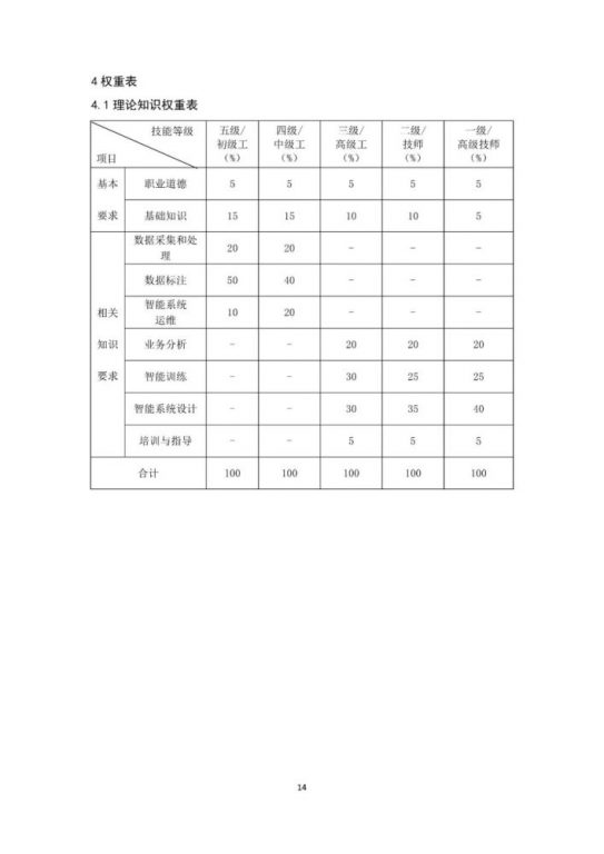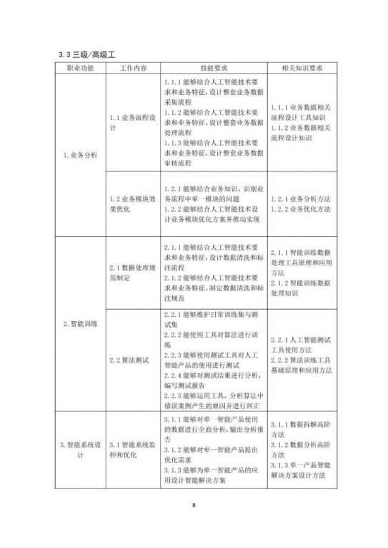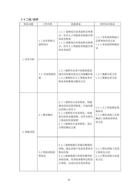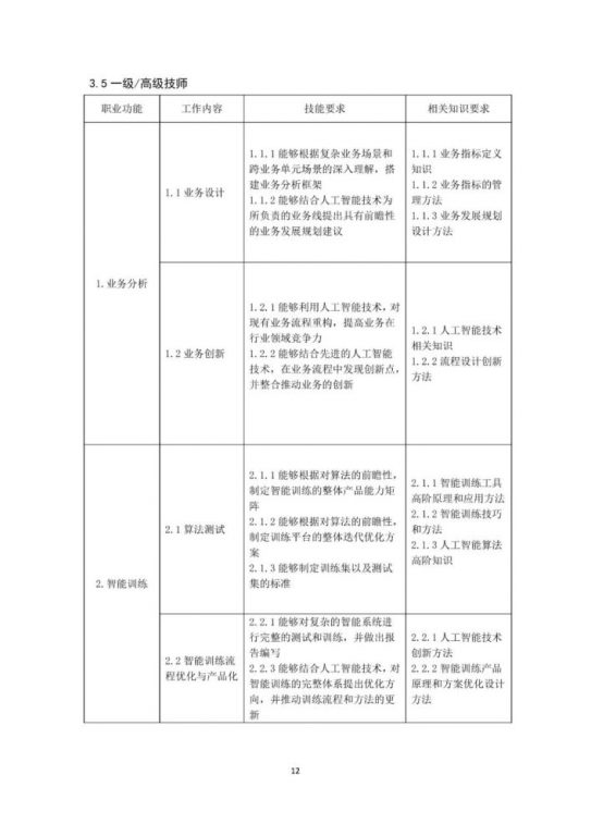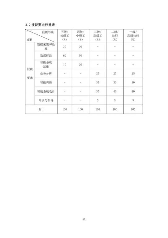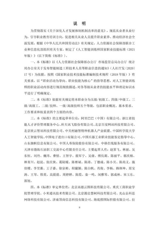 本《标准》以《人力资源社会保障部办公厅市场监管总局办公厅统计局办公室关于发布智能制造工程技术人员等职业信息的通知》(人社厅发〔2020〕17号)为依据,按照《国家职业技术技能标准编制技术规程(2018年版)》有关要求,以“职业活动为导向、职业技能为核心”的指导思想,对人工智能训练师的职业活动内容进行规范细致描述,对各等级从业者的技能水平和理论知识水平进行了明确规定。